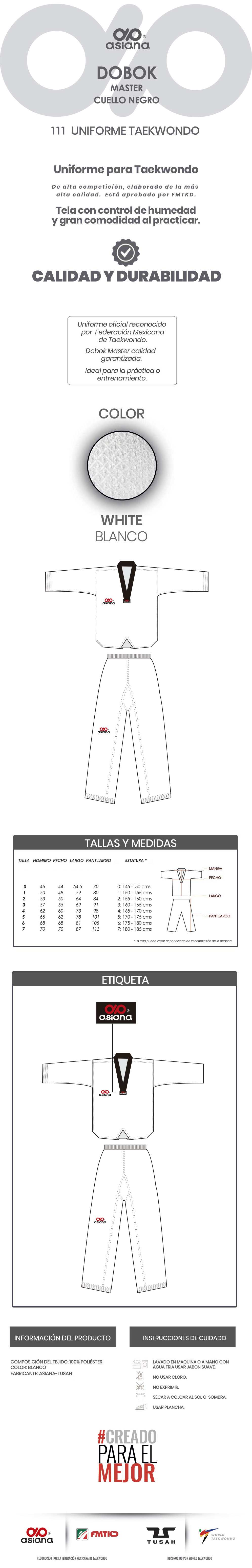 Uniforme de alta calidad, ideal para la práctica y competencia, tela fresca y ligera con mesh en las axilas, uniforme reconocido por la FMTKD, con bordado de la Federación Mexicana de Taekwondo en el brazo derecho.